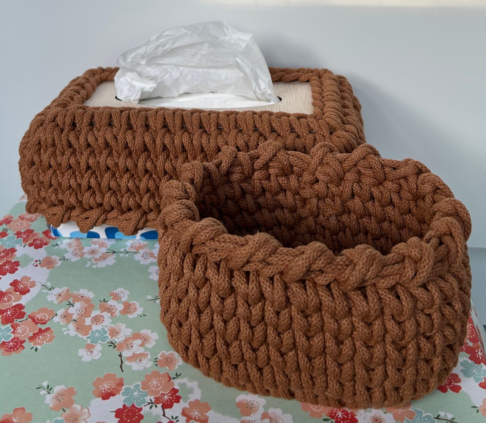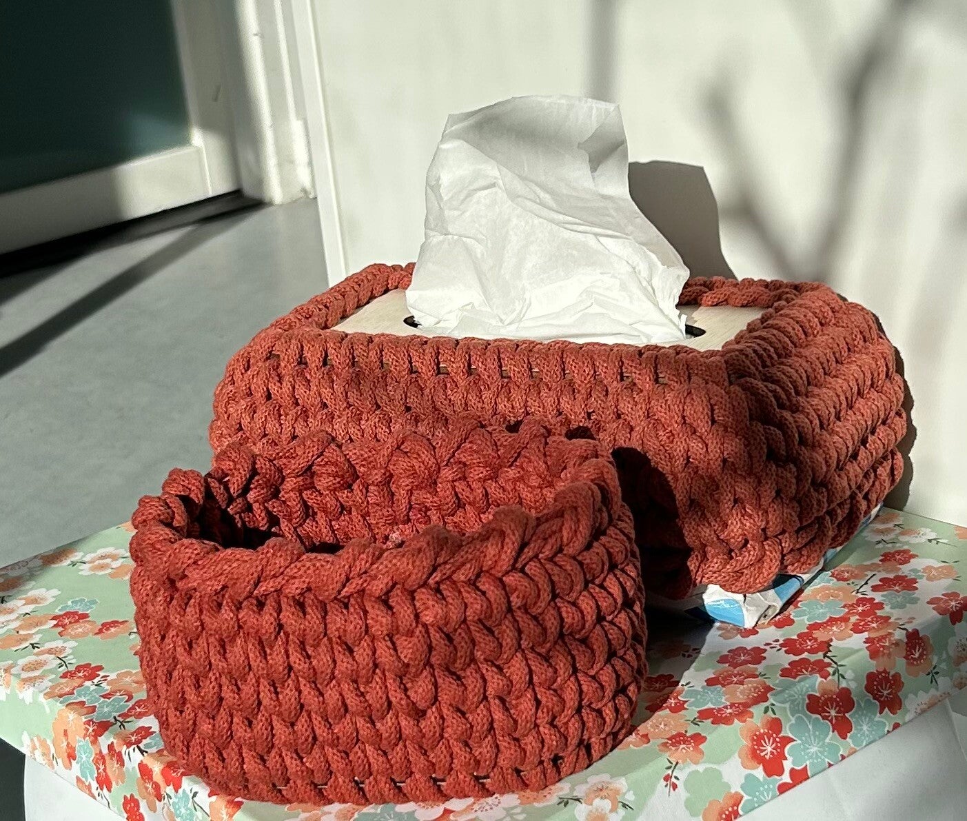 Creeër rust in je interieur met een gehaakte tissuecover en kleine mand set. Geen los slingerende kleine spullen meer in huis of een tisuedoos die verstopt moet worden, omdat deze niet bij het interieur past.